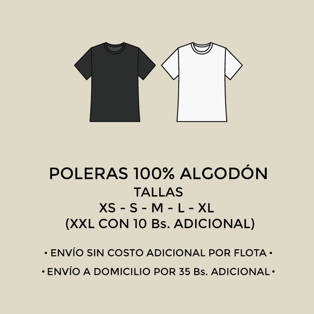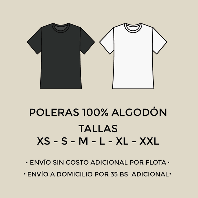 ⬤ 100% Algodón ⬤ Tallas: XS - S - M -L - XL - ( XXL más 10 bs. )⬤ EnvÃos sin costo adicional por flota ⬤ Envios a domicilio con 35 bs. adicional.